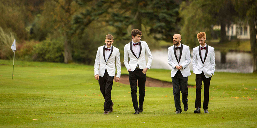 4 men in white dinner jackets and bow ties on a golf course at Gleneagles