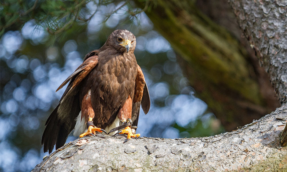 One of the most fascinating aspects of Harris hawk behaviour is their social structure. They live in groups called “casts,” which can consist of up to six individuals, usually including a dominant breeding pair and their offspring from previous years. The Harris hawk’s breeding habits and the early life of their chicks are marked by a high degree of parental care and social cooperation and the family group continues to support the fledglings for several months. The dominant female is the only one to mate, with other females helping to raise the young, forming a strong hunting pack. Packs can reach up to 16 birds. In the wild, males flush out prey for females and are allowed to feed from the kill as a reward for their teamwork.