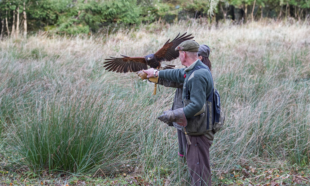 Then there’s Jim Bob, our energetic superstar. He’s an exceptional hunter, even catching pheasants mid-air—a rare feat for a male Harris hawk! When he’s bored on a slow hunt, he loves swooping over to snatch Steve’s (our instructor) hat. Quite the character, isn’t he?