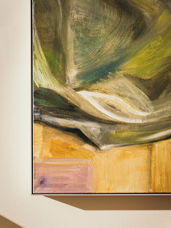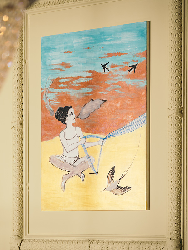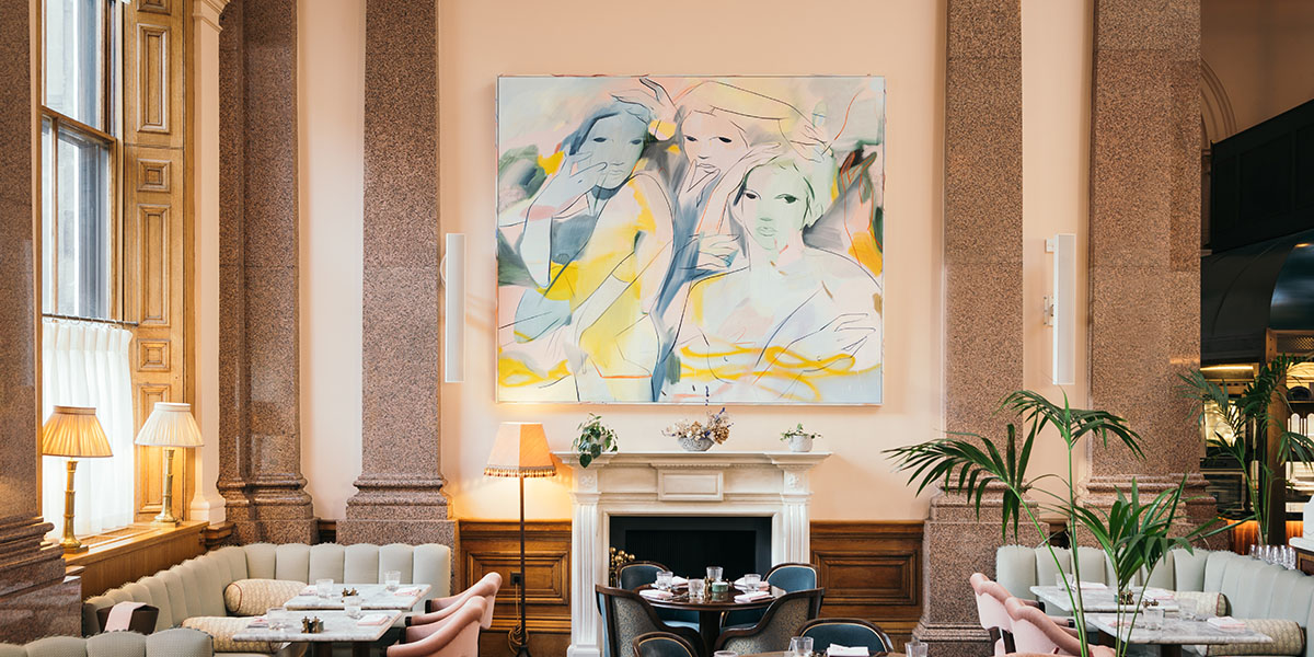 Sigrid’s favourite piece from the collection comes from France-Lis McGurn, a Glaswegian artist who is rapidly garnering international acclaim for her lyrical paintings. Her vibrant commissions for The Townhouse take centre stage in The Spence’s dining room, with use of bright colour and sweeping brushstrokes to depict exuberant female bodies. Her capricious compositions are, in their freedom of form and expression, unrestrained, with her paint transcending the canvas on the frame of its stretcher. Not only does this reinforce the theme of the creative potential of women when liberated, the bright colours also complement the art-deco glamour of the space, evoking a joyful Belle Époque charm that softens the opulent banking hall.