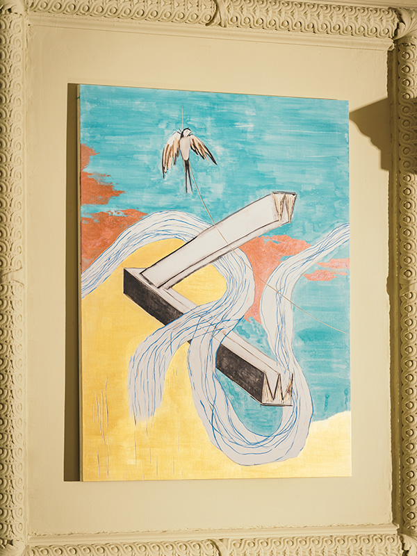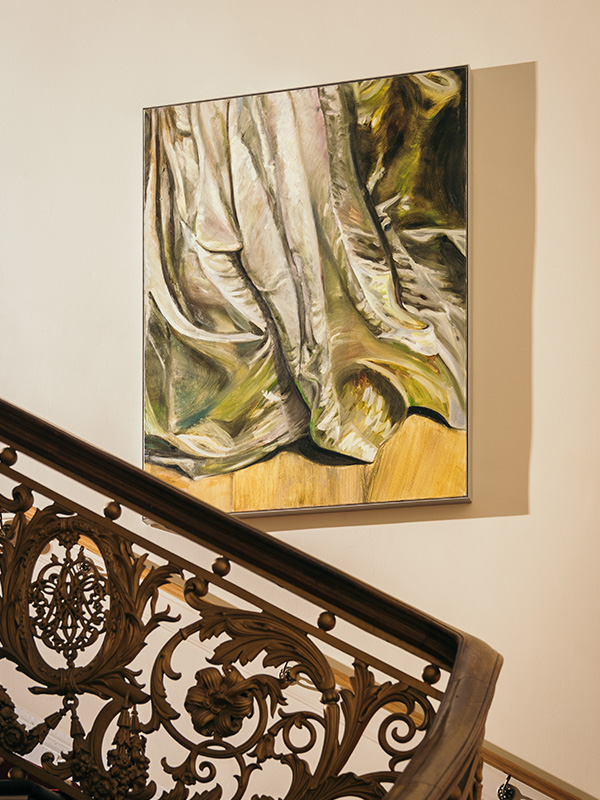 Linen and its production thematically imbues much of the art that embellishes the Townhouse. This is expressed perhaps most explicitly in Gaia Fugazza’s four-panel painting found in The Note Burning Room. Fugazza’s work famously explores the troubled relationship between humans and the natural environment, portraying characters interacting with a natural and technological world, that in this piece depicts the stages of linen production, featuring women picking and combing the material in vivid gold, white and blue. This four-part painting was made on wood, then carved, burned, waxed and painted with self-made mineral paints, emulating a medieval painting style. Symbolically, the wood-panelled boardroom where this celebration of female craft now hangs was previously emblazoned with portraits of the male board members who would predominantly occupy the space.