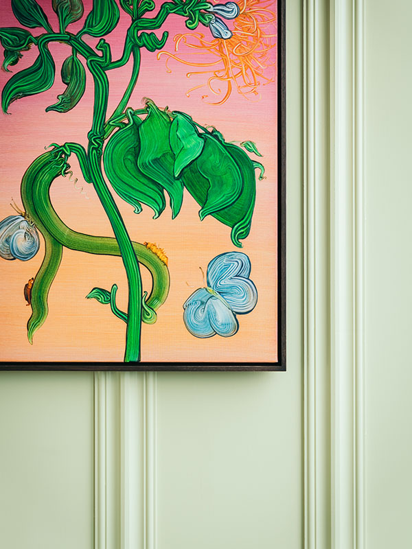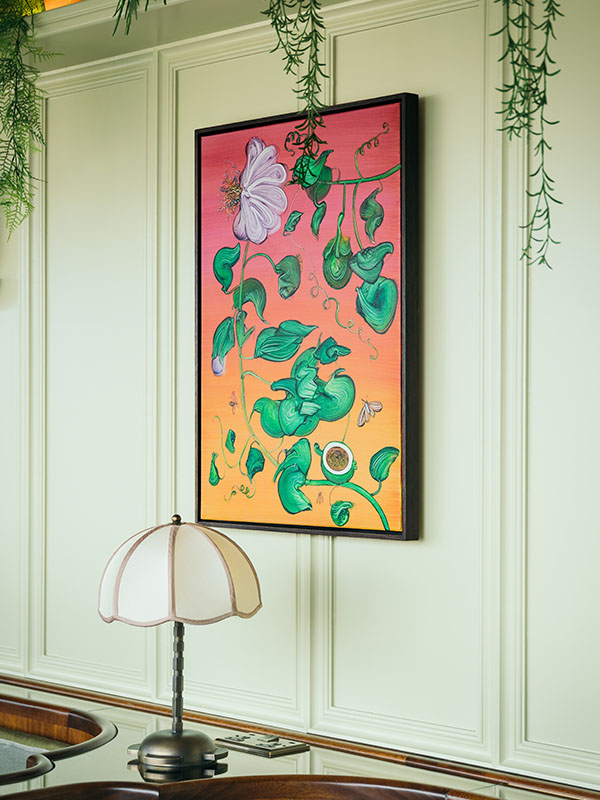 Working to avoid use of the muted spectrum of colours often found in landscape art, but still wanting to draw from the archetypal Scottish palette that’s so synonymous with Gleneagles, Kirk commissioned paintings by Mimei Thompson to decorate the Townhouse’s Lamplighters bar that would represent the rich flora and fauna of Scotland but dialled up to create a tension that ensures the space feels modern and intriguing. Thompson’s pastel neon suite of works, with acidic colour contrasts, depicts plants unwinding in a surrealist representation of a nocturnal garden to evoke a sense of enchantment and feverish midnight dreams. Perfect for the mood of our roof terrace cocktail bar, the art pleasingly disrupts the clean uniformity of Lamplighters interiors to alter perceptions and engage, whilst representing foliage and botany to reflect the seasonal focus of Lamplighters mixology.